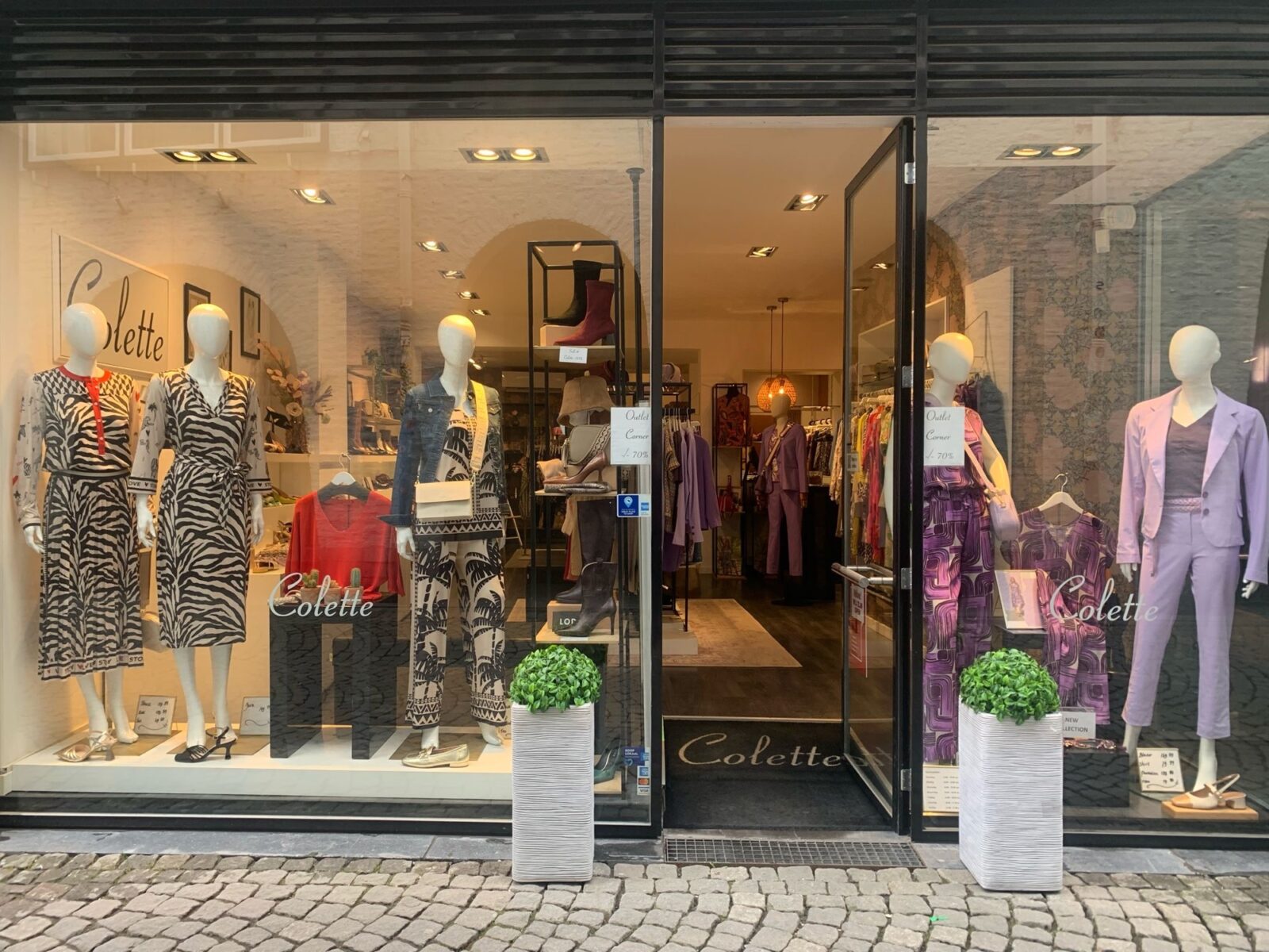 In de kleine etalage combineren we de kleur lila in een mooi pak van Jane Lushka en een set in een jumpsuit-look van La Fee Maraboutée. De combinaties maken we af met de bijzondere schoenen van Lodi en Lodi-Love❤️