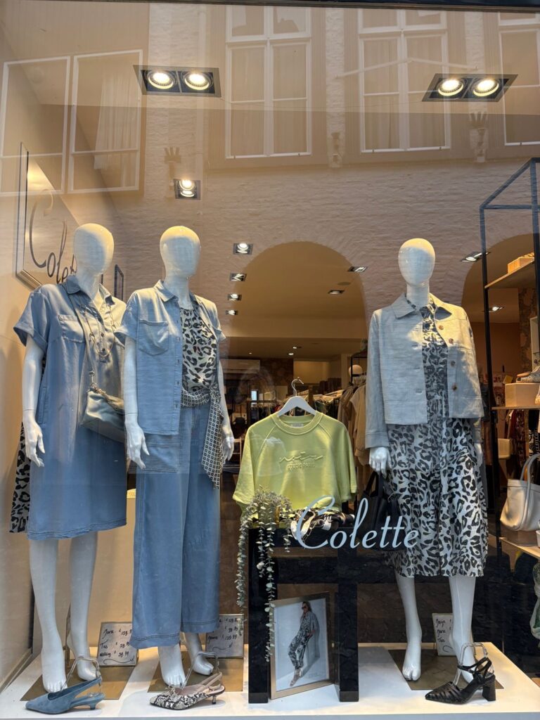 Deze week een frisse voorjaar etalage, met in de grote etalage Catnoir in een mooie licht blauwe Lyocell gecombineerd met een frisse Leopard print in blauw tinten met een vleugje geel.