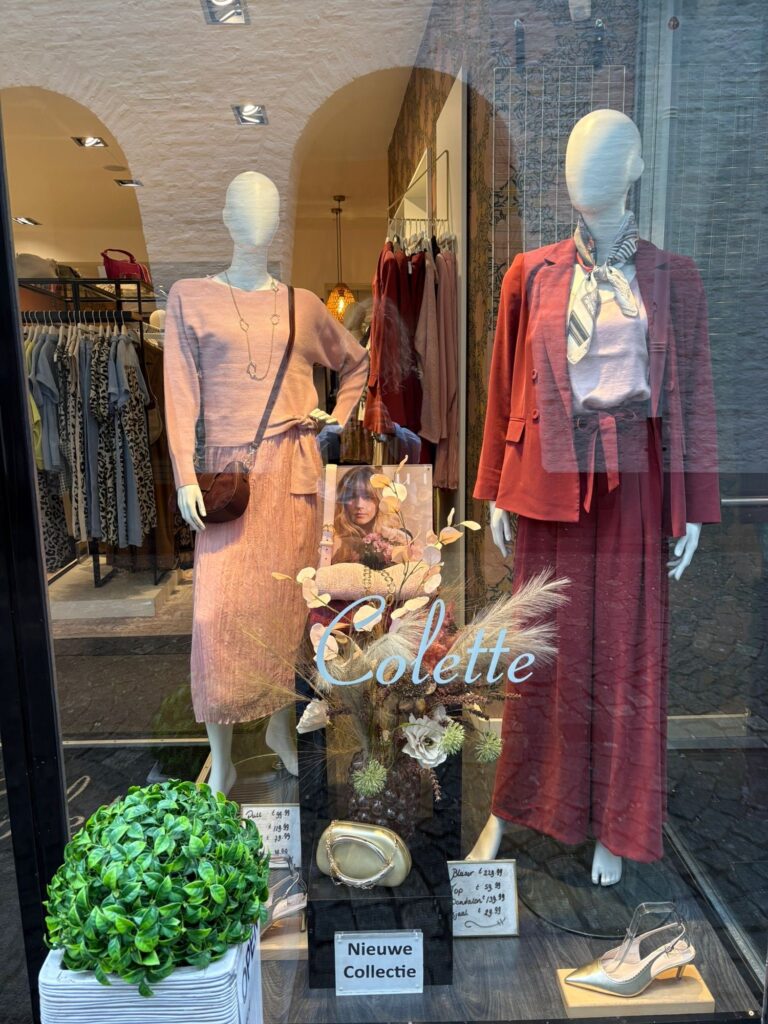 In de kleine etalage hebben we Oui, een mooi pak in een bijzondere kleur rood. We combineren al dit moois met a touch of pink🌸