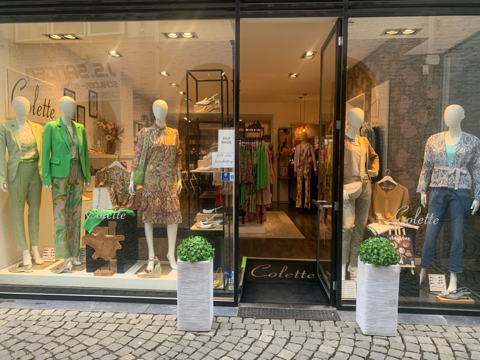 De kleine etalage is wat stoerder, mooie jasjes en tops van het Franse Label Eva Kayan met een heerlijke jeans van Para Mi, we zien het, we voelen het, het voorjaar is begonnen.