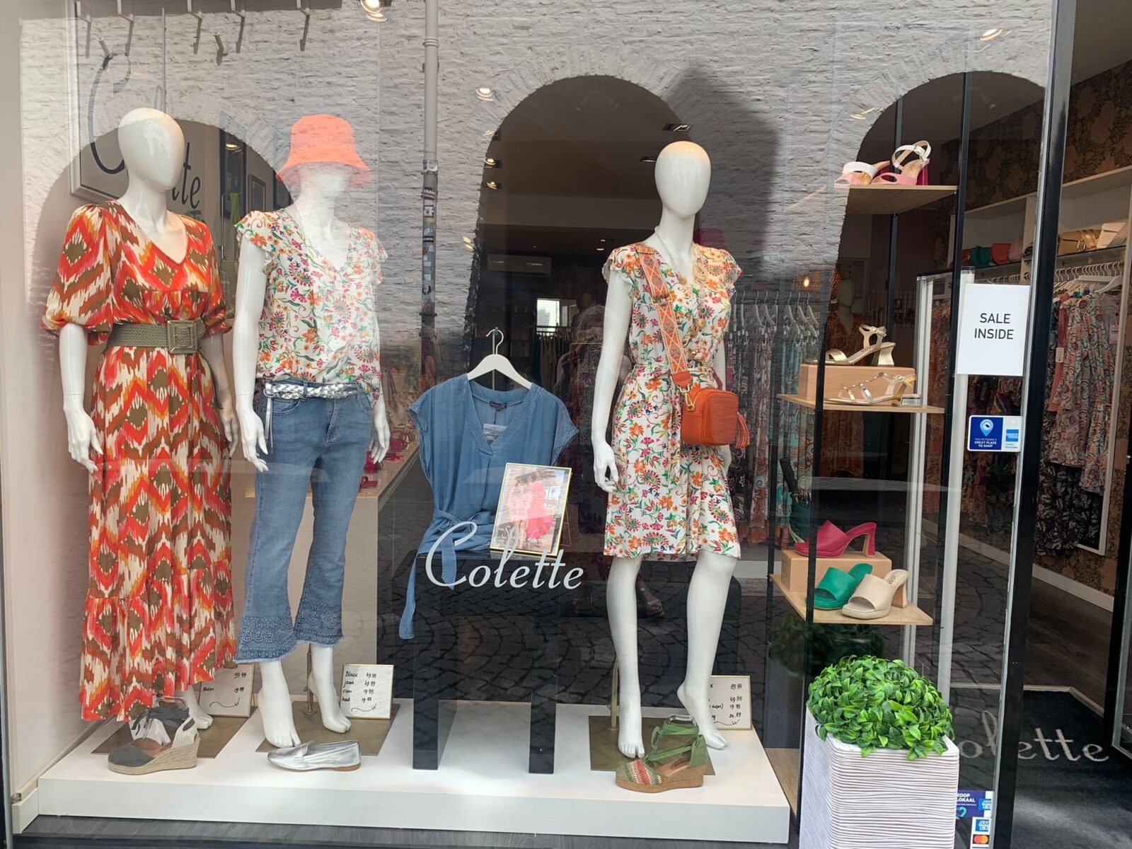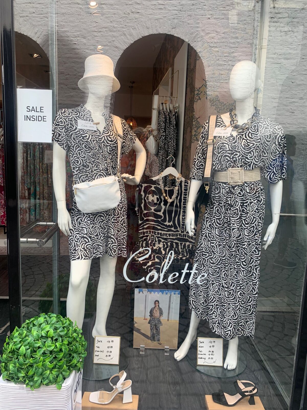 Nieuwe Etalage Colette Maastricht, links in de grote etalage showen we de maxi-dress die never out of style is, draag hem los of met een ceintuur. De kick flare cropped jeans mag ook zeker niet gemist worden dit seizoen, wij combineren het met een leuke top met een accent op de mouwtjes. Het frisse jurkje in 100% viscose altijd goed, dit moois is allemaal van Smashed Lemon.