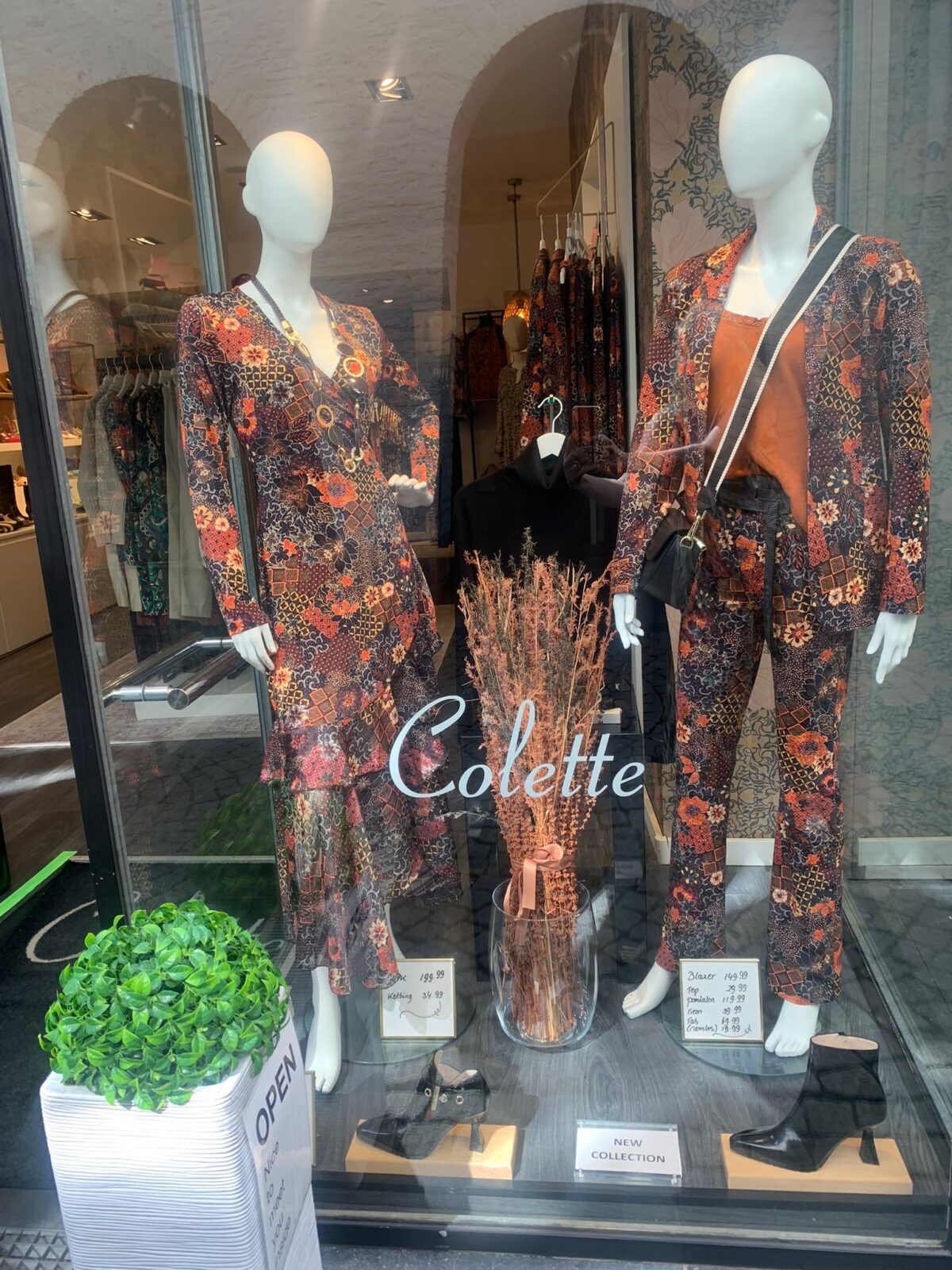 Etalage Colette Maastricht, deze week in de grote etalage La Fee Maraboutee, het eigenwijze Franse label, dat zich vooral uit in mooie prints en materialen. Het merk leent zich voor dagelijkse mooie combinaties, maar zeker ook voor een speciale gelegenheid. In de kleine etalage zien we een supermooie herfst print van Tessa Koops, stoer in een statement pak of in haar alom bekende maxi-jurk, een ding is zeker “you will stop traffic” met deze outfits! Wij maken deze mooi sets af met de speciale Spaanse schoenen van Lodi en Lodi Love……