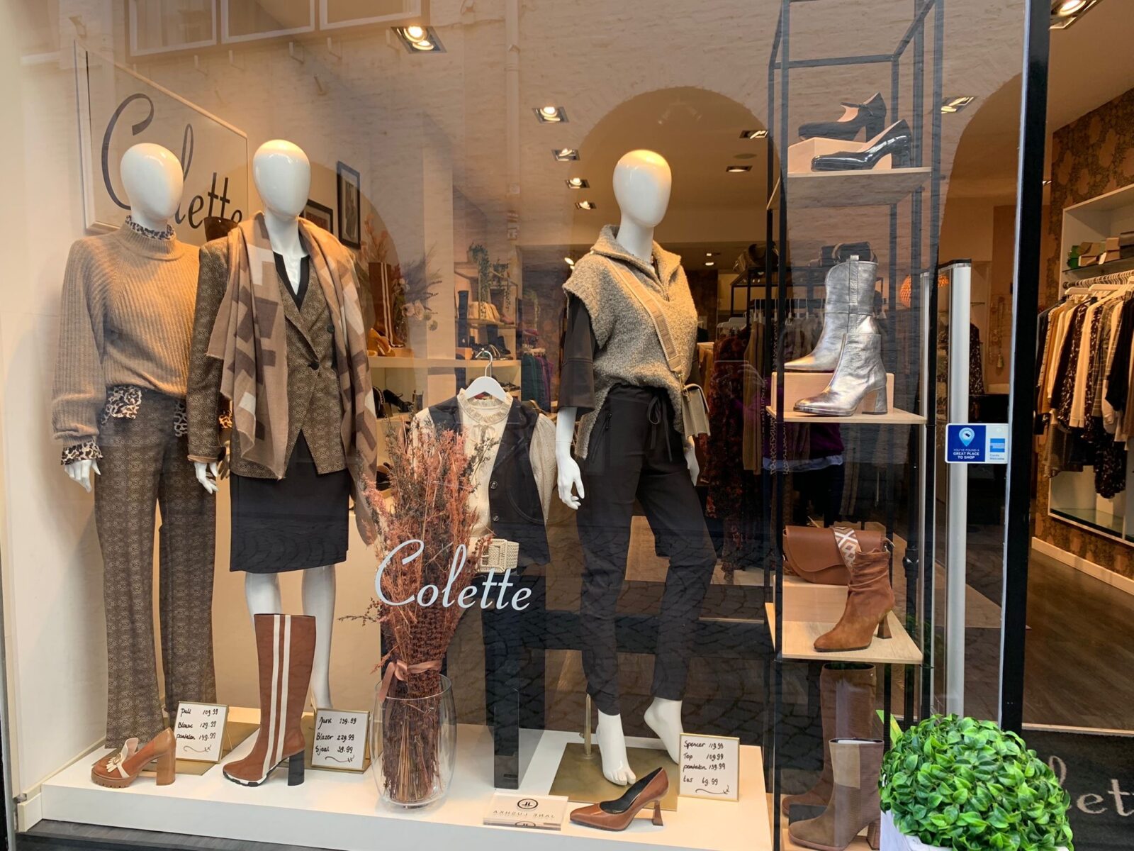 Etalage Colette Maastricht, deze week Jane Lushka nieuwe levering, mooie beige print gecombineerd met donker bruin, hoe mooi si dit? Wist jij dat Jane Lushka hun unieke Travelstof laten fabriceren in Italië? Dat deze kwaliteit was in was uit heel mooi blijft, kleur vast is en absoluut geen pillen krijgt. Wij zijn fan van dit stoere vrouwelijke Travelstof label. Ook hun truien zijn een extra vermelding waard, die worden in hun thuishaven Bulgarije vervaardigd, mooi dicht bij huis dus heel milieu bewust. In de kleine etalage zien we Eva Kayan met een stoere panterprint in een mooie stretch stof, er loopt een bies langs de broekspijp en langs de mouw, heel subtiel maar heel effectief. Het leather-look jurkje is ook een kenmerkende stof van dit leuke Franse label. De Herfst is eindelijk in Town, wanneer vul jij je garderobe aan, met deze mooie iconische items, die seizoen na seizoen mooi blijven? Wacht niet te lang. Zoals vele al weten, hebben wij meestal maar 1 item per maat. De mooie collecties kleden wij af met de prachtige schoenen van Lodi en Lodi Love.