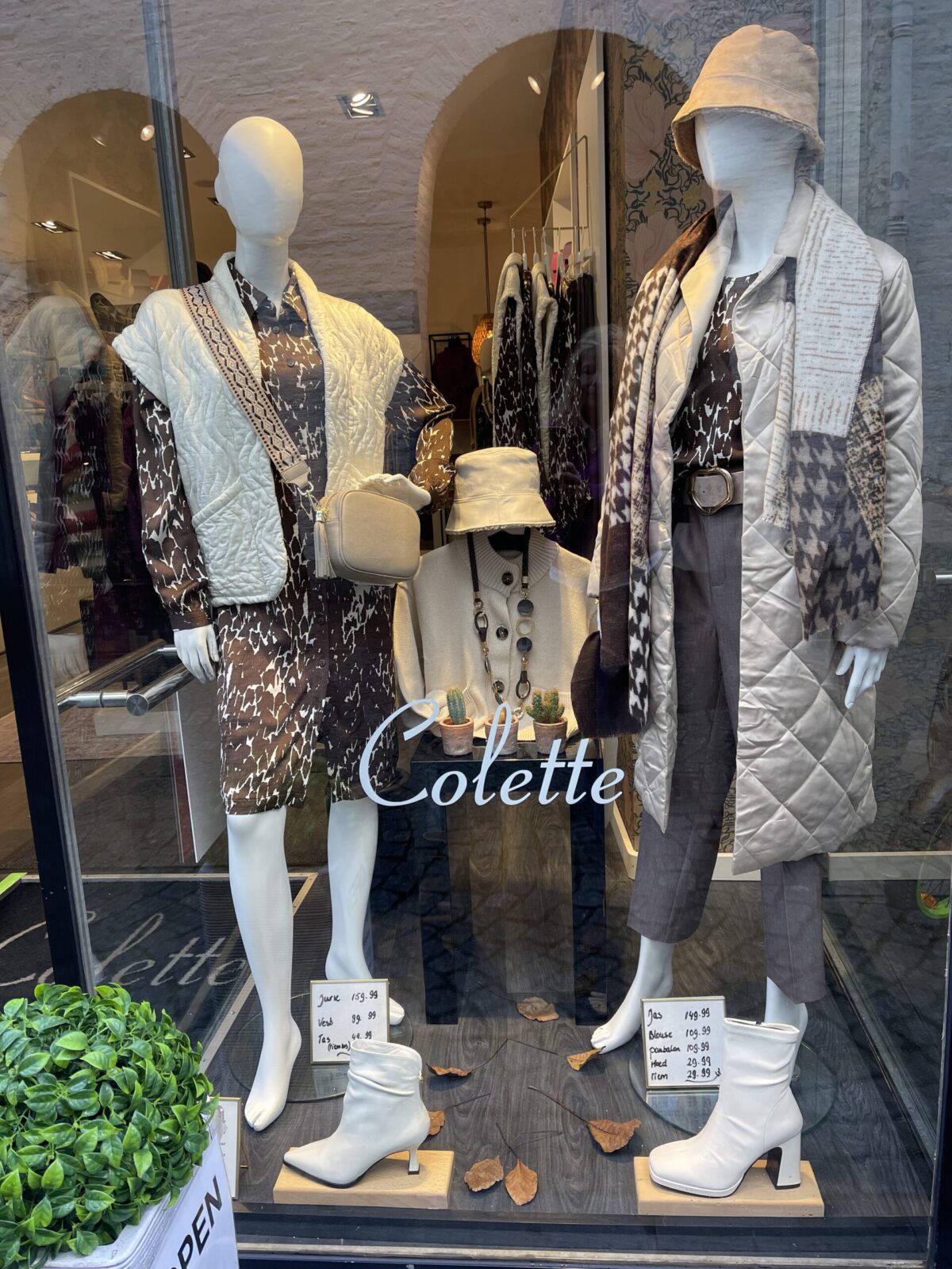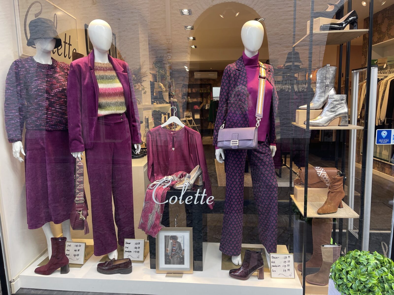 Etalage Colette Maastricht, de dames staan weer te shinen, in deze mooie dieproze kleur “Figue”, van het eigenwijze Franse merk La Fee Maraboute. Mooie soepele ribfluweel in zowel een midi-rok, lekker Retro en een mooi rechte pantalon. We combineren deze mooie items met heerlijke warme truien, want of je het nu leuk vind of niet, het wordt kouder! Het pak mag zeker niet missen in je garderobe en de comfort van deze kwaliteit is subliem. In de kleine etalage hebben we Part-Two gecombineerd met wat items uit de Colette Collectie (alleen in de winkel verkrijgbaar). De jurk en top is van zo’n rijke, zware, glanzende viscose, dat moet je gewoon voelen! De broek is van Inwear, die perfect past in dit plaatje. We kleden het geheel af met onze schoenen van Lodi en Lodi-Love. Hebben wij je nieuwsgierig gemaakt? Kom binnen en kom gewoon lekker passen, kleding op een hanger bekijken is “not the same”, dan wanneer je het even aan trekt! En let op!! Passen is gratis.
