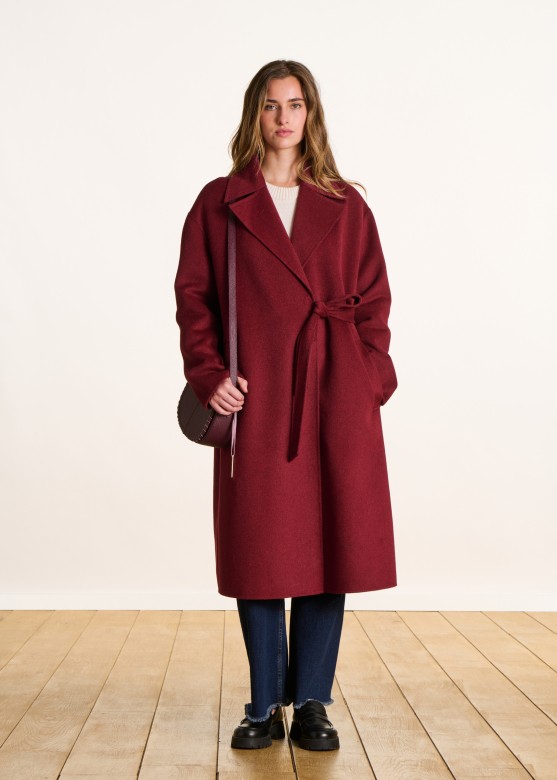 Lange jas van double-faced wol, oversized model, brede kleermakerskraag, paspelzakken, sluiting met strik.