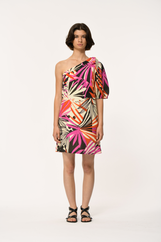 Korte jurk met één schouder van katoenlinnen met bloemenprint, 7/8 mouwen, trekkoord bij de halslijn.