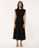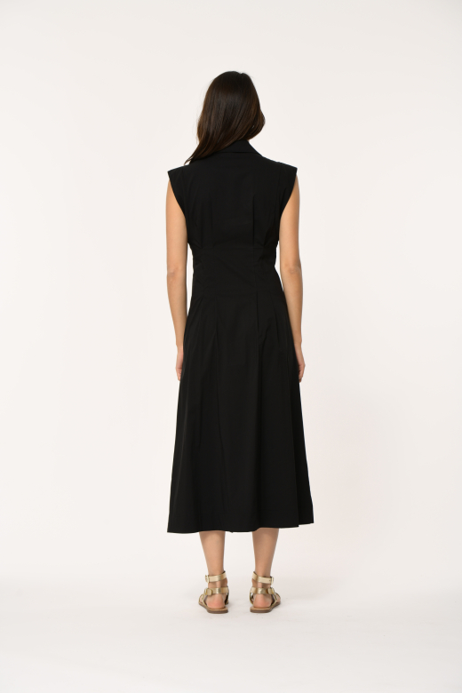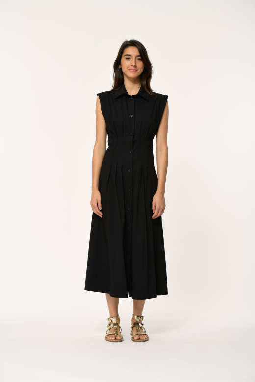Lange poplinjurk met overhemdkraag, korte mouwen, platte plooien aan de voor- en achterkant in de taille voor een getailleerd effect, zijzakken.