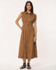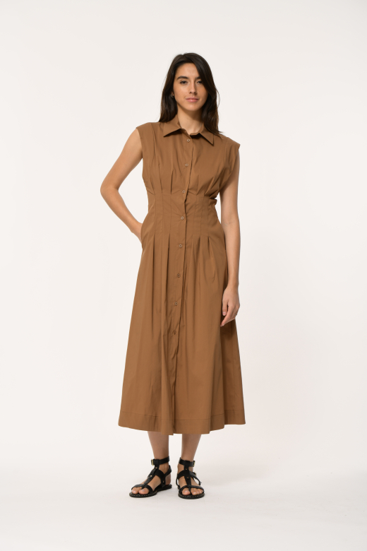 Lange poplinjurk met overhemdkraag, korte mouwen, platte plooien aan de voor- en achterkant in de taille voor een getailleerd effect, zijzakken.