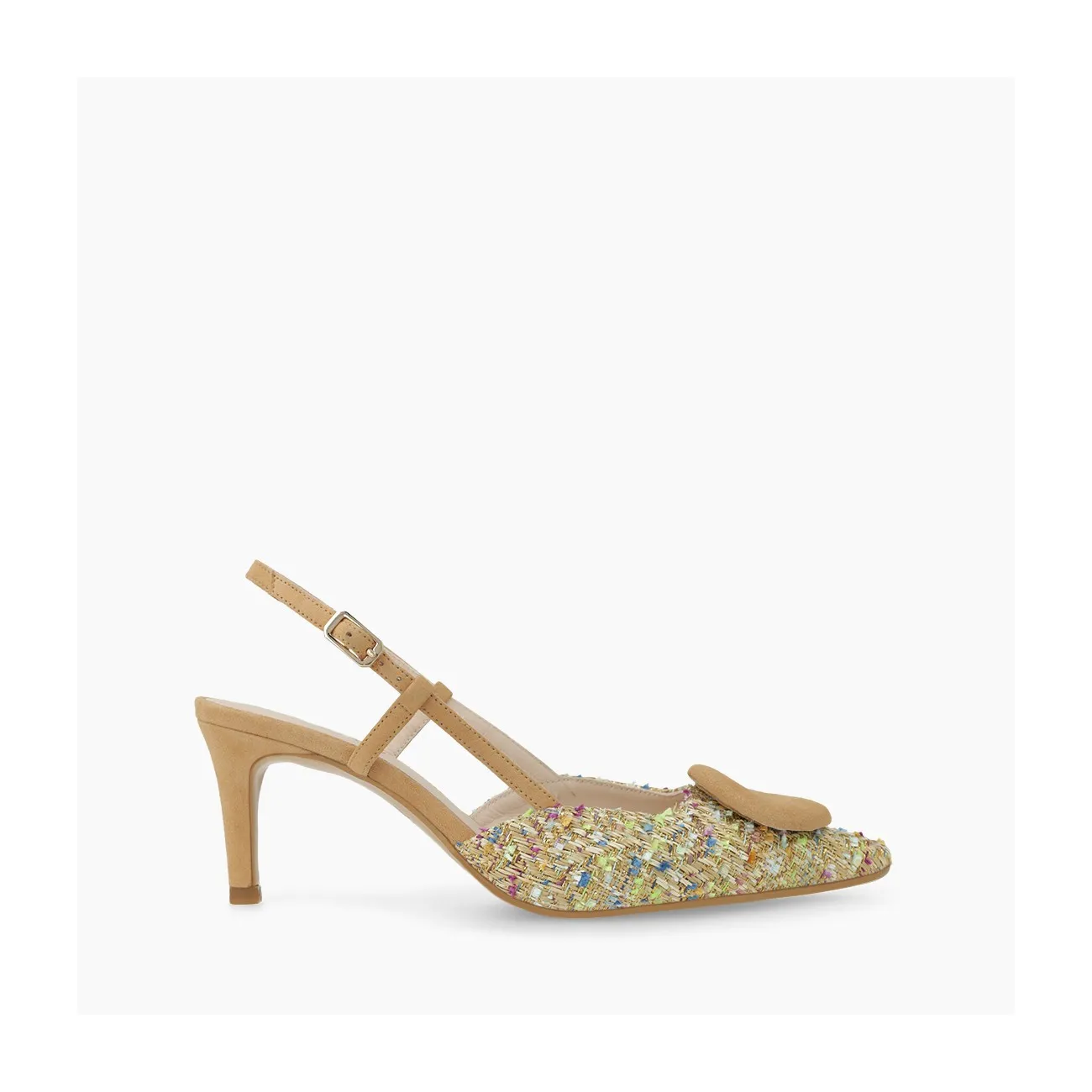 Dames NIVIS slingback pumps van LODI in suède en stof. De combinatie van suède met veelkleurige stof met raffia-effect is een opvallend kenmerk. Ze hebben een stilettohak van 6,5 cm, een metalen gesp aan de zijkant, een spitse neus en een vierkante wreef. De binnenkant is gevoerd met leer. Ze zijn voorzien van een nieuwe gel-inlegzool voor extra comfort bij elke stap. Gemaakt in Spanje.