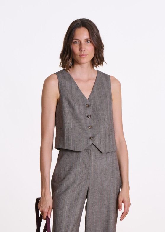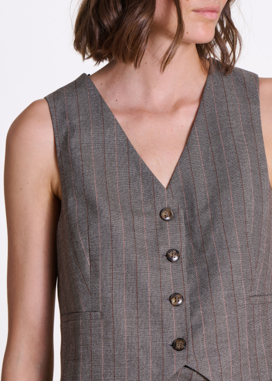 Getailleerde gilletje in gestreepte stof, v-neckline, bevestigd met 4 knoppen, paspel-zakken.
