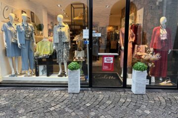 Deze week een mix van merken in de grote etalage. Links hebben we een mooie jurk van Eva Kayan. De jurk is schuin gesneden en valt daarom altijd heel mooi door de natuurlijke rek in de stof. Daarnaast mooie satijnen set, bestaande uit sportief jasje en een mooie maxi jurk. De jurk heeft een veter…